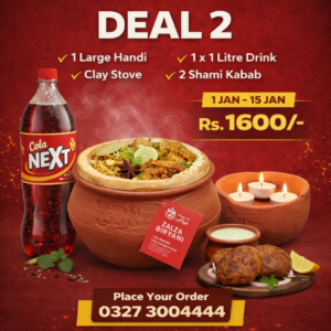 ₨ 1,150Select options This product has multiple variants. The options may be chosen on the product page Buy Via WhatsaApp1 x Regular Handi 1 x 500ML Drink 2 x Shami kabab 1 x Clay Stove
